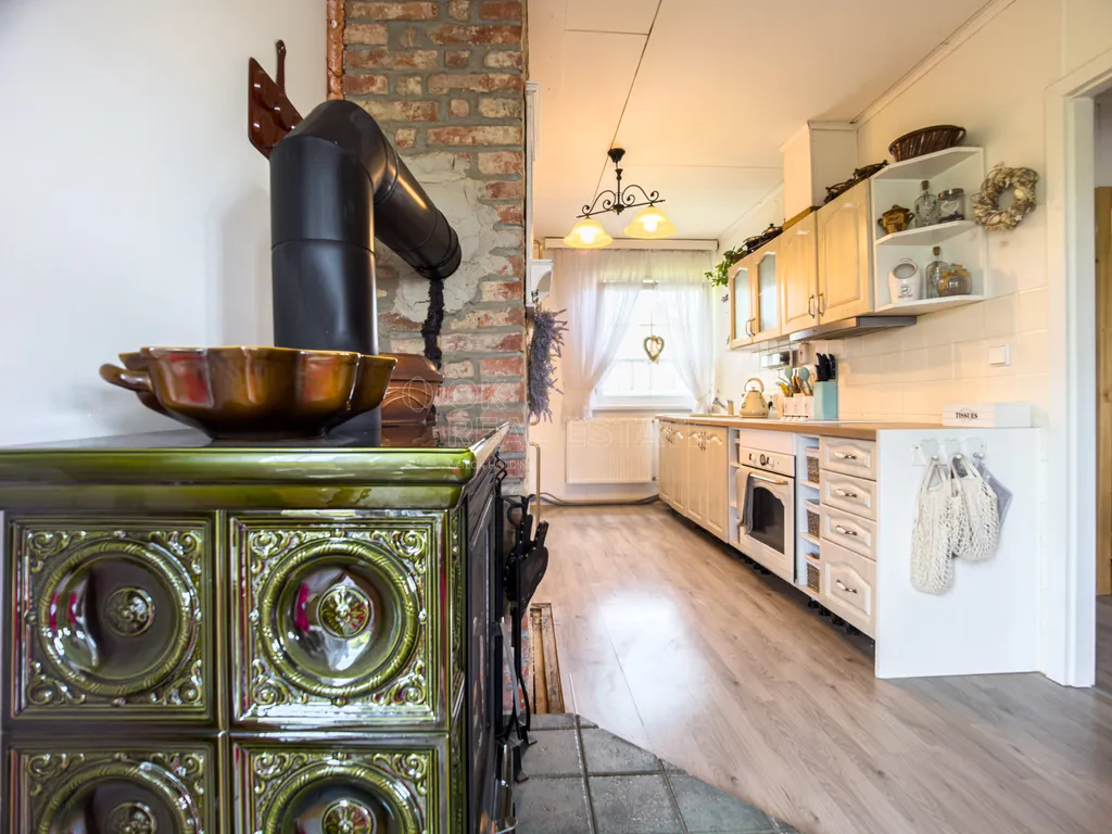 Druhé nadzemní podlaží nabízí komfortní a vzdušný obývací pokoj, kuchyni s krásnými kachlovými kamny, koupelnu a další samostatný pokoj.