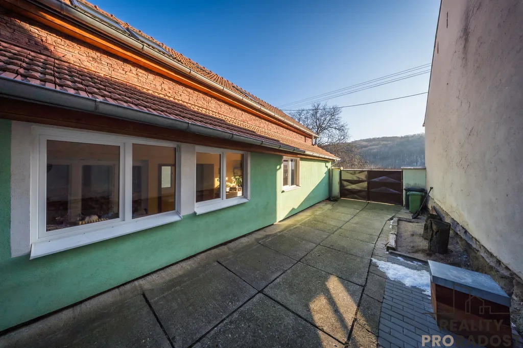 Na uzavřeném dvoře, je k dispozici stání pro 2 auta, studna s užitkovou vodou a dílna. Na zahradě se nachází posezení a kvelbený sklep, kde je možné vychutnávat klid a pohodu, neboť zahrada nabízí prostor pro relaxaci a zahradničení. Přístup na zahradu je možné i ze zední strany pozemku.