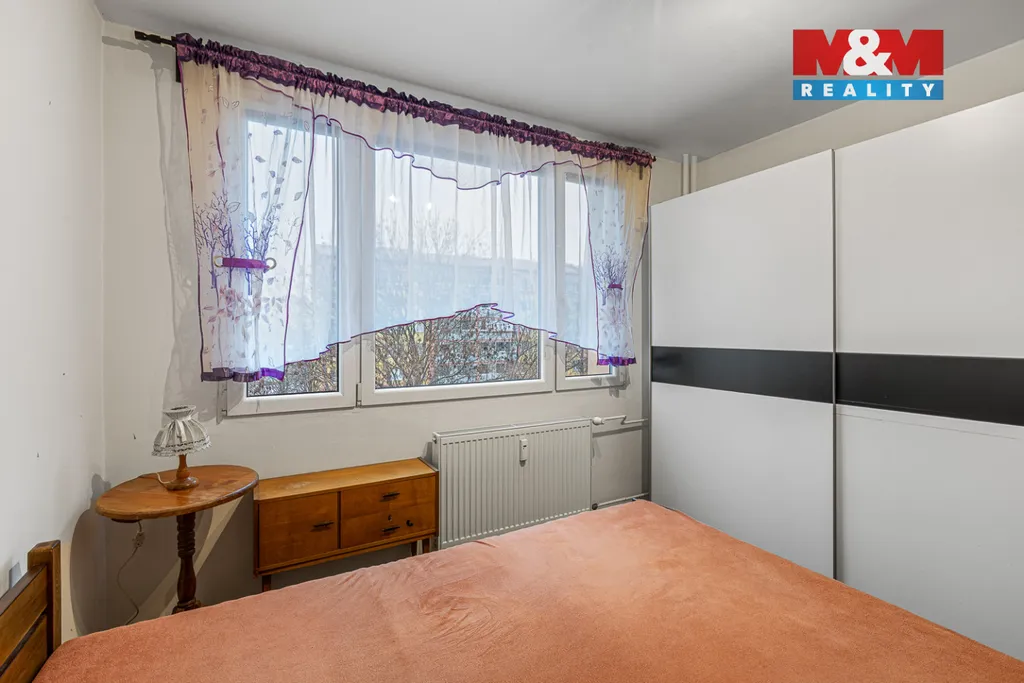 Vstupní chodba bytu se nachází dispozičně uprostřed, vlevo od ní je obytná část, vpravo spací, klidová část bytu. Rovně z chodby se dostaneme do zděné koupelny s WC, které je odděleno příčkou. Obývací pokoj je prostorný, od kuchyňského koutu je oddělen barovým pultem a jsou tu dvě velká okna s výhledem na Moskevskou ulici, na přilehlý velký mostecký park a s orientací na jih. Dvě ložnice jsou pak orientovány na sever a výhled mají do parčíku, za kterým jsou další bytové panelové domy.