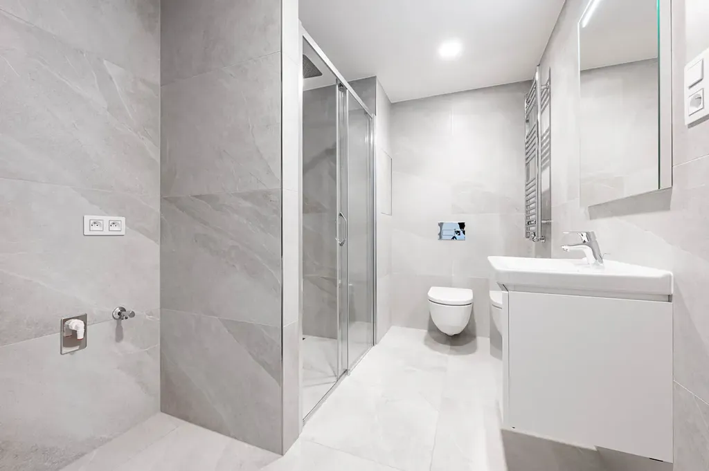 Koupelna má sprchový kout a pračku, je spojená s WC. Předsíň nabízí instalovanou šatní skříň (dostatek úložných prostor).