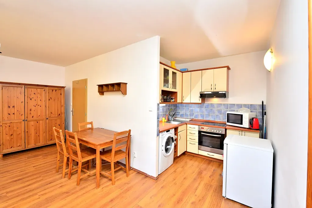 Vybavený kuchyňský kout s elektrickou varnou deskou, elektrickou troubou, ledničkou a pračkou. Byt je zařízen nábytkem, jídelním stolem se židlemi, kovovou postelí, šatní skříní a komodou. V koupelně je sprchový kout, umyvadlo a toaleta. Vytápění a ohřev vody je řešeno dálkově. Dům je postaven na počátku milénia, je zateplen a má plastová eurookna.