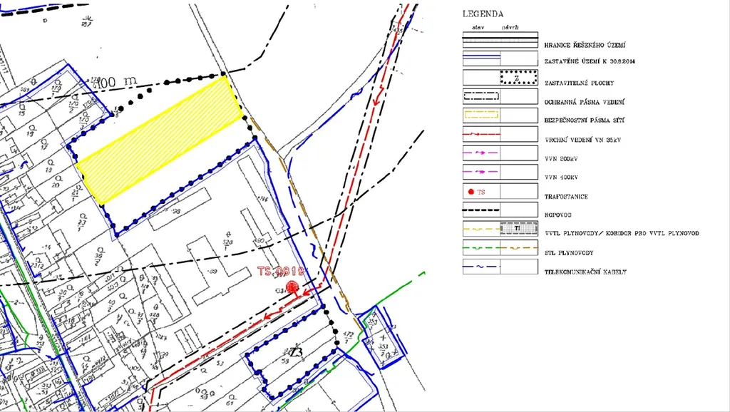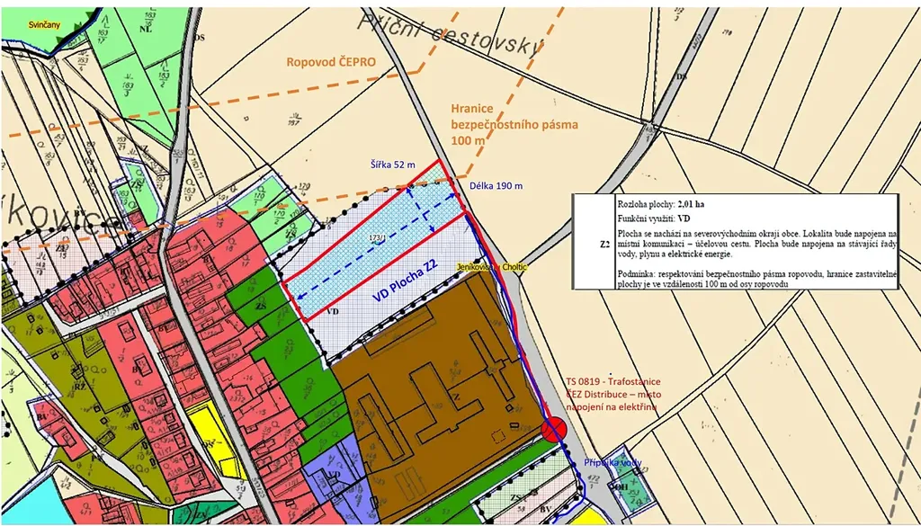 Nabízíme k prodeji stavební pozemek v k.ú. Jeníkovice u Choltic o celkové výměře 9 416 m2. Tento pozemek je územním plánem určen pro výrobu a skladování a lze ne něm bez problému stavět. Šíře pozemku činí 51 m délka je 190 m. Je potřeba se připojit na trafostanici ČEZ Distribuce, případně si zřídit vlastní trafostanici na pozemku. Pozemek je jen malou částí dotčen bezpečnostním pásmem ropovodu, který je v majetku ČEPRA.