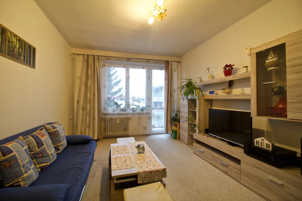 Byt disponuje obývacím pokojem o výměře 17,26 m² se vstupem na lodžii (3,82 m²), která nabízí příjemné posezení s výhledem na jih. Ložnice o velikosti 12,65 m² má praktický výklenek se šatní skříní. Kuchyně v dekoru dub sonoma je vybavena plynovým sporákem a nabízí místo pro pračku. Výhodou je také spíž a další úložný prostor nad chodbou vedoucí do kuchyně. Koupelna je laděna do moderní černé barvy a je vybavena vanou a umyvadlem. Obývací pokoj je zařízen pohovkou, obývací stěnou a konferenčním stolkem. K bytu náleží dva sklepy o výměrách 1,7 m² a 4,2 m².