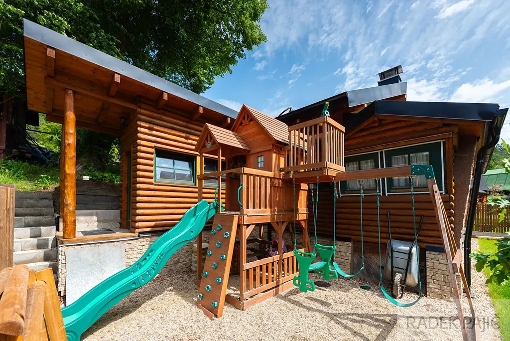 - Zahrada v rovině, zatravněná, s vyvýšenými záhony, dětským hřištěm a dřevníkem