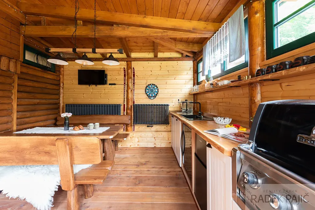 - Dvě plně vybavené kuchyně (v chatě i v pergole), betonové dřezy Blanco, spotřebiče Gorenje
