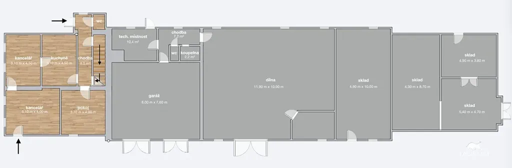Komerční prostory o výměře přes 300 m2 tvoří 2 dílny s vlastním sociálním zázemím a velký skladový prostor. 1 z dílen je aktuálně pronajímána jako autoservis, druhá nabízí stejný potenciál nebo jiné podnikatelské využití. Nad dílnou a skladem se nachází půda.