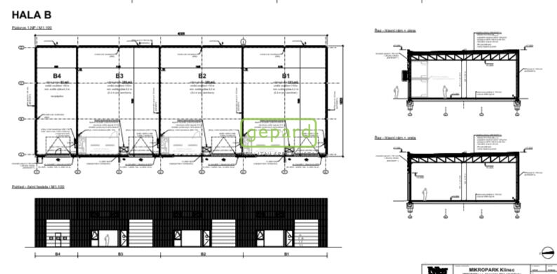 Hala B - celkem 4 kóje, 3x 188-191 m2 + 1x 94 m2, celkem 661 m2 nájemní plochy.