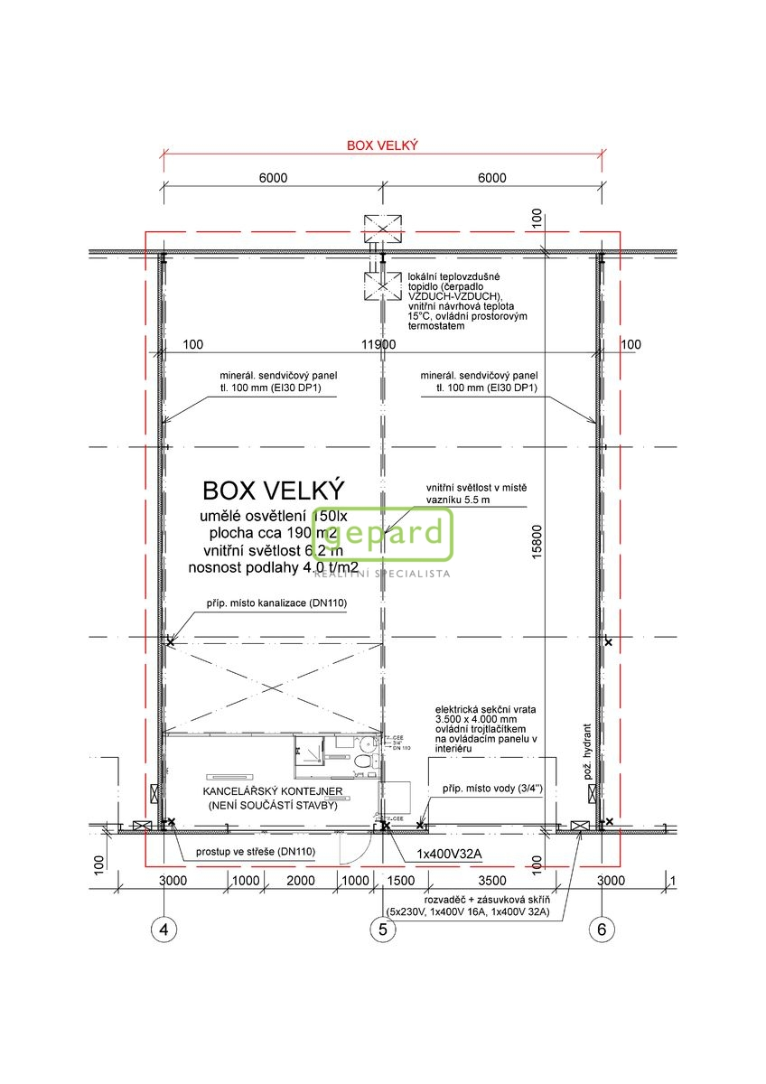 - 1x zásuvková skříň: 5x 230V, 1x 400V 16A a 1x 400V 32A