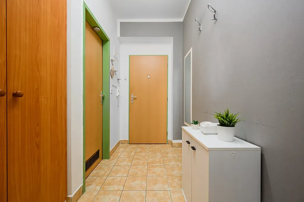 Byt se skládá ze vstupní chodby s vestavěnou skříní, zděného jádra koupelny s vanou a wc a