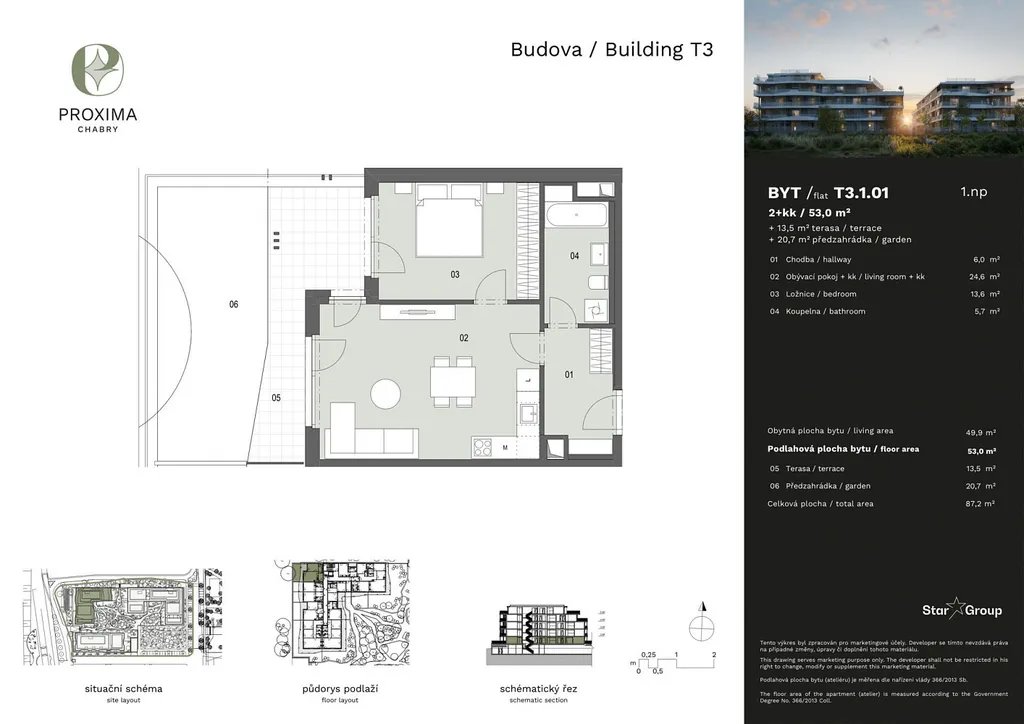 Tento byt 2+kk o velikosti 53 m² se nachází v 1. podlaží terasového bytového domu nové etapy Proxima – moderního rezidenčního areálu navazujícího na oblíbené Nové Chabry. Díky velkým oknům, nadstandardnímu prosvětlení a promyšlenému urbanistickému řešení nabízí tento byt prostředí, které si okamžitě zamilujete. V rámci bytu se můžete těšit i na vlastní soukromou zahradu o 20,7 m² doplněnou o terasu o velikosti 13,5 m².