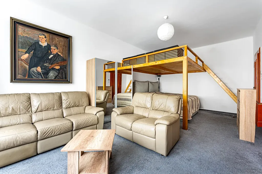 Byt sestává z otevřené předsíně spolu s kuchyní (vestavné spotřebiče - varná deska, digestoř, trouba, myčka, pračka), 2x pokojů a koupelny s vanou a WC. V jednom pokoji je praktické patro na spaní. Více na přiloženém půdorysu.