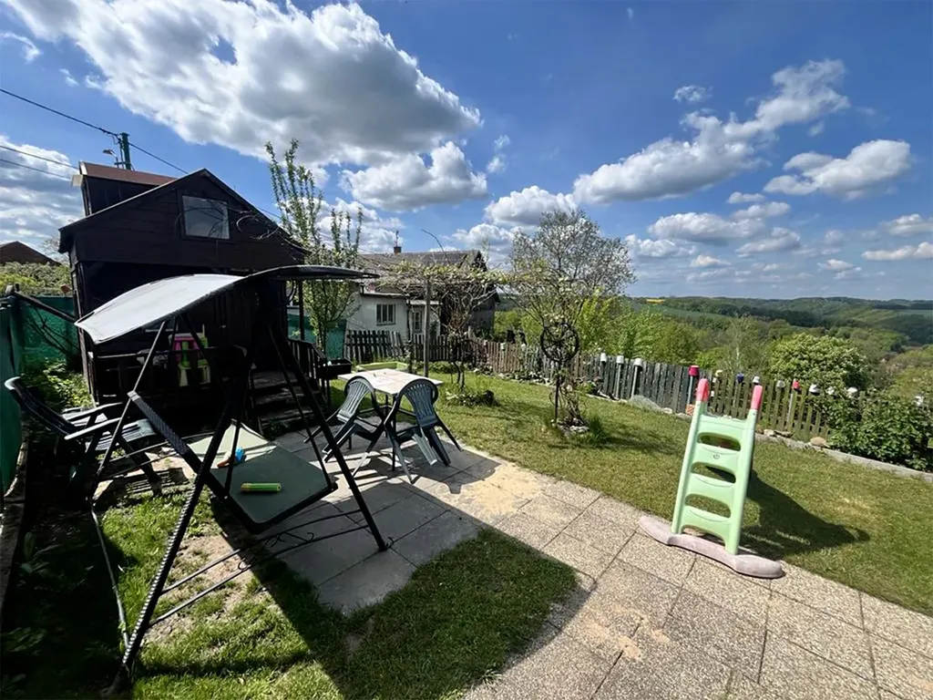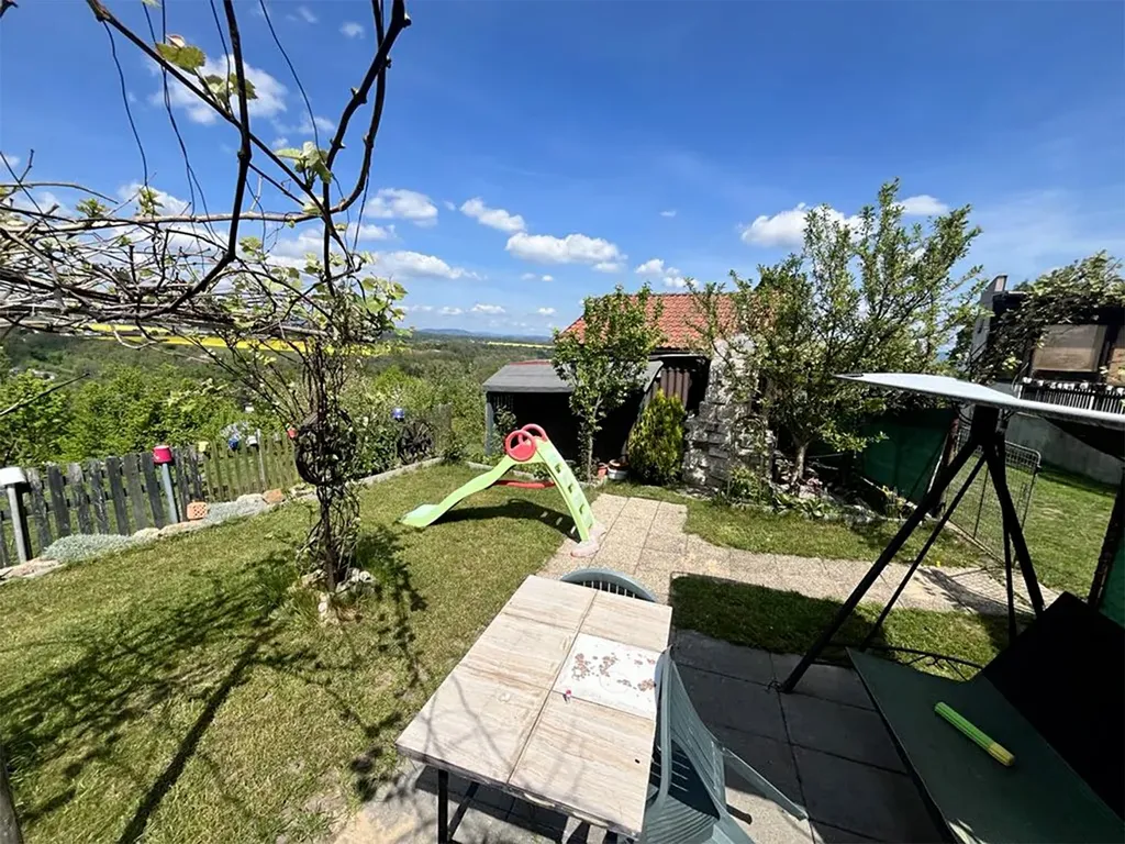 s výhledem do kraje. Díky poloze domu a zahrady je zde celý den slunce.