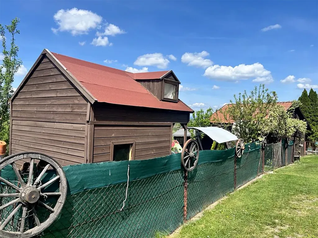 samostatném oploceném pozemku se zahradou, je zde elektřina a možnost vody. Díky větší