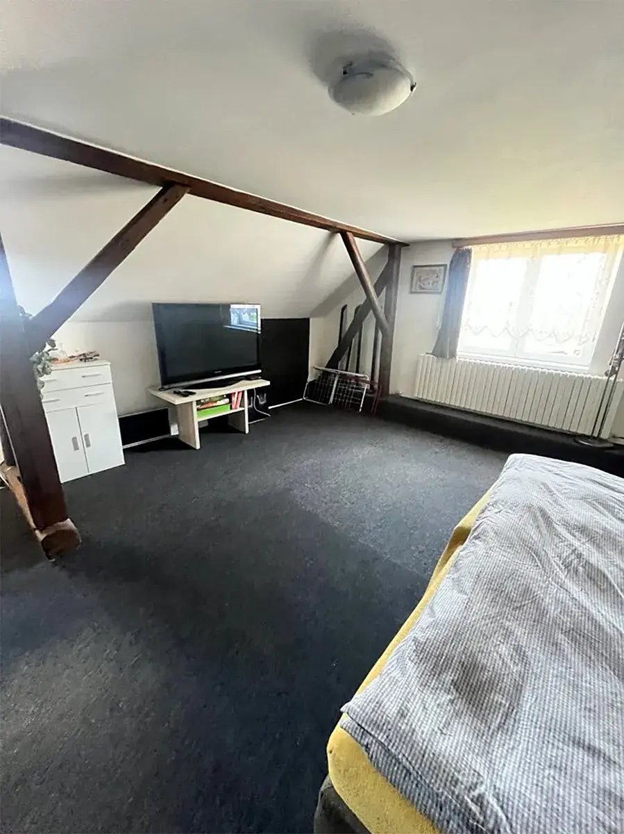 druhé straně od schodiště, je vybudovaná další velká ložnice. V domě je menší sklep, kde je hlavní