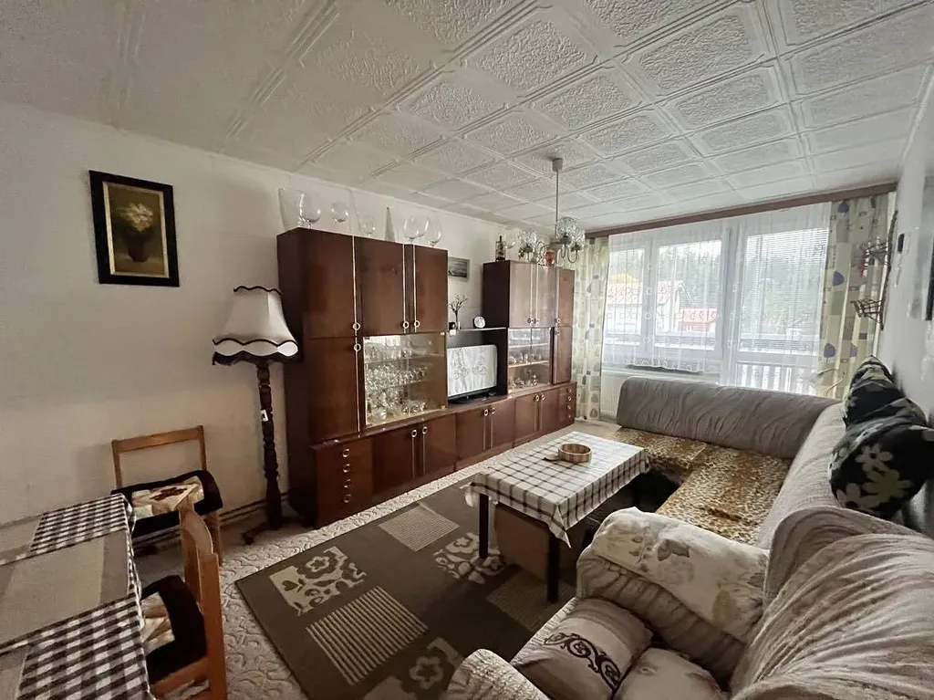 Prodej bytu 2+1 se zasklenou lodžií v osobním vlastnictví. Výměra bytu je 57,21 m2 a mimo byt jsou k dispozici sklepní prostory a pozemek kolem domu. Část pozemku je vyhrazena na parkování pro 8 bytů v domě. Každý byt má své topení. Byt je ve zvýšeném přízemí a jeho dispozice je velmi dobrá. Z předsíně je vstup do všech místností, koupelny i WC. Koupelna má výměru necelé 3m2 a je zde sprchový kout s umyvadlem. WC je samostatné a výměra je necelý 1m2. Kuchyň je velká 7,89m2 a je zde kuchyňská linka se sporákem, jídelní stůl se židlemi. Ložnice má výměru 16,12m2. Ložnice s kuchyní mají výhled na pozemek za domem – do klidu a zeleně. Obývací pokoj má výměru 19,56m2 a zasklená lodžie je 3,67m2 ( nezapočítává se do plochy bytu ). Z lodžie je výhled na město a zeleň před domem. Byt má vlastní elektrokotel, který je umístěný v suterénu domu. Koupelna a WC je zděná, jinak je byt v původním, ale zachovalém stavu. Harrachov a jeho sportovní využití je k dispozici. Výhodou je parkování a úložné prostory na kola a lyže.