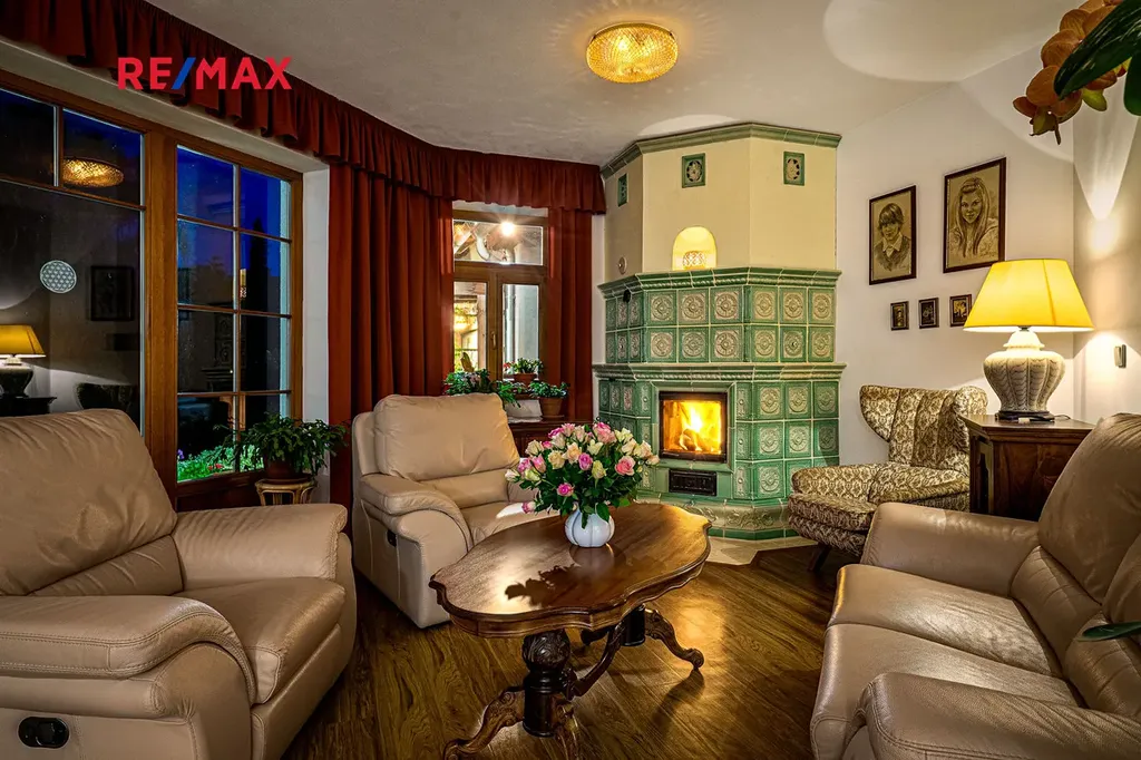 Hlavní místností prostorného rodinného domu je obývací pokoj s kuchyní a s krásnými kachlovými kamny, která zejména v chladných měsících vybízí k příjemného posezení za zvuku praskajícího ohně. Z obývacího pokoje je pak nádherný výhled a přímý vstup do pohádkové zahrady.