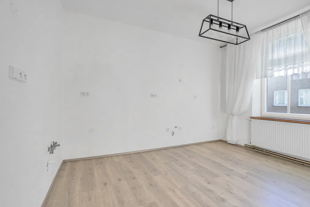 V bytě jsou plastová okna a díky poloze a orientaci je zde dostatek světla i slunce. Aktuálně jsou zde připraveny rozvody na kuchyňskou linku dle představ nového vlastníka a možnosti užívání bytu jako 1+1 nebo 2+kk. Drobným zásahem lze upravit dispoziční řešení tak, že kuchyně bude spojena s obývacím pokojem ve vedlejší místnosti a přepažením stávajícího prostoru kuchyně vznikne ložnice. Tato případná úprava je znázorněna ve vizualizaci.