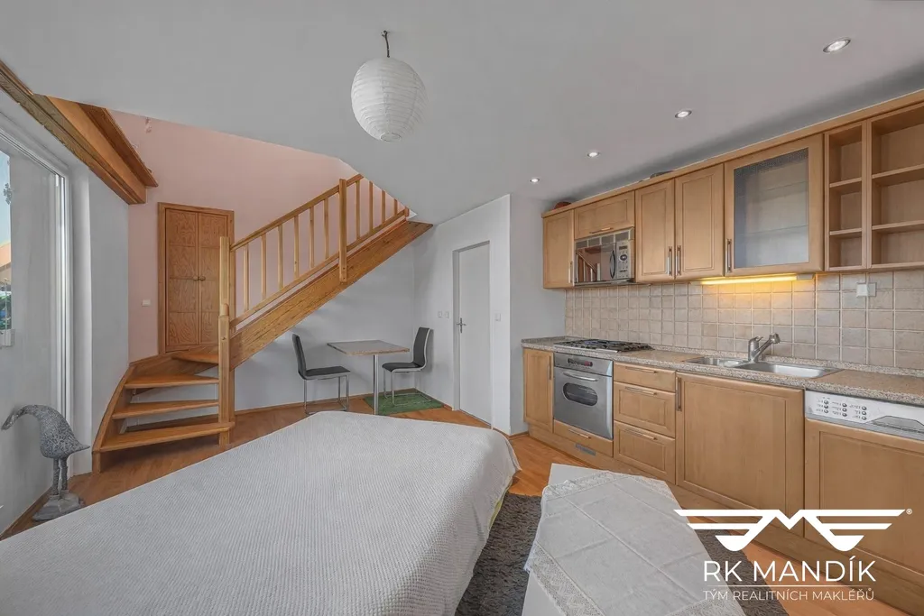 Dispozičně je byt řešen jako menší mezonet. V hlavní úrovni se nachází obývací prostor s kuchyňskou linkou a spotřebiči (myčka nádobí, elektrická trouba, mikrovlnná trouba, lednice s kombinovaným mrazákem). V obývacím pokoji může po dohodě zůstat pohovka. Na obývací část navazuje vstupní chodba s úložným prostorem a koupelna s vanou a pračkou. Z obývacího pokoje je přímý vstup na menší terasu, která nabízí příjemné místo k odpočinku.