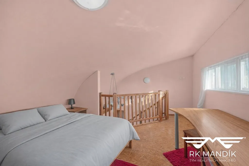 Po schodech se dostanete do horního patra, kde je umístěna ložnice s prostorem také na pracovní stůl. V bytě je navíc praktická komora (není zakreslena v půdorysu), kterou oceníte na uložení věcí, které nechcete mít na očích.