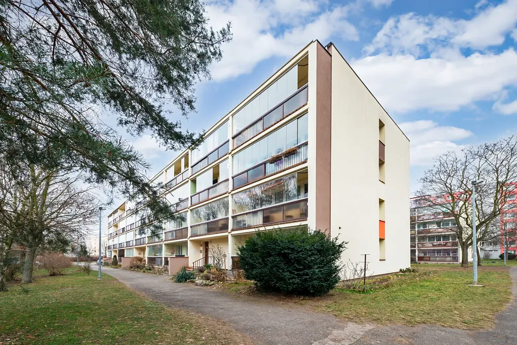 Byt je výborně řešený: vstupní chodba s vestavěnými skříněmi prakticky odděluje dvě neprůchozí ložnice od prostorného obývacího pokoje orientovaného na jih, ze kterého je přímý vstup na balkon – ideální místo pro ranní kávu nebo večerní relax.