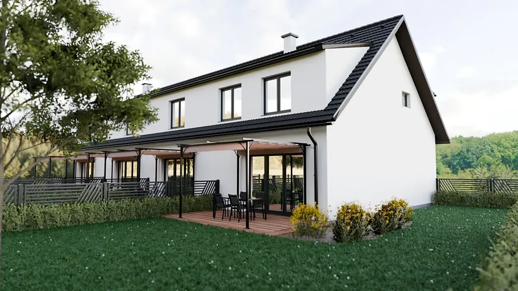 V budově se nachází pouze čtyři řadové domy dvou velikostí, nabízející klidné a moderní bydlení s dostatkem soukromí.
