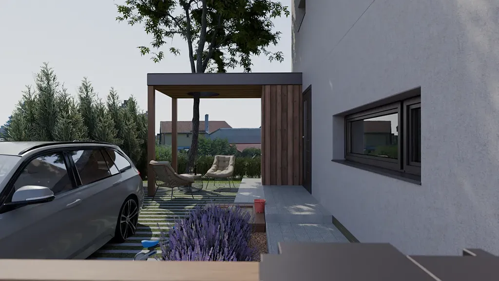 K domu náleží dvě parkovací místa přímo na pozemku a venkovní přístřešek.