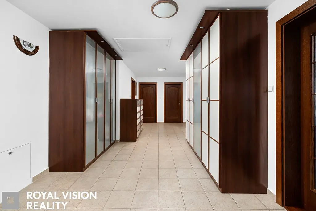 Prostorná vstupní chodba tvoří příjemný vstup do bytu. Dominantou je obývací pokoj s krbem a vstupem na balkon. Kuchyni lze ponechat otevřenou nebo ji uzavřít dveřmi. Byt disponuje velkou chodbou se spoustou úložných prostor, komorou na potraviny, skladem, samostatným WC a koupelnou s vanou i sprchovým koutem. Nechybí ložnice a pracovna.