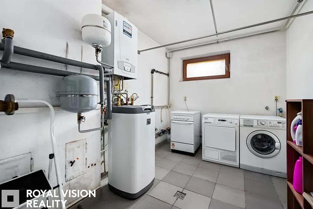Aktuálně je zde velký sklad, posilovna, WC, sprchový kout a prostorná místnost s přímým vstupem ven. Celý prostor je velmi dobře větraný díky oknům. Součástí je také garáž pro dvě auta se sekčními vraty a přípravou pro elektromobil (360 kabel).