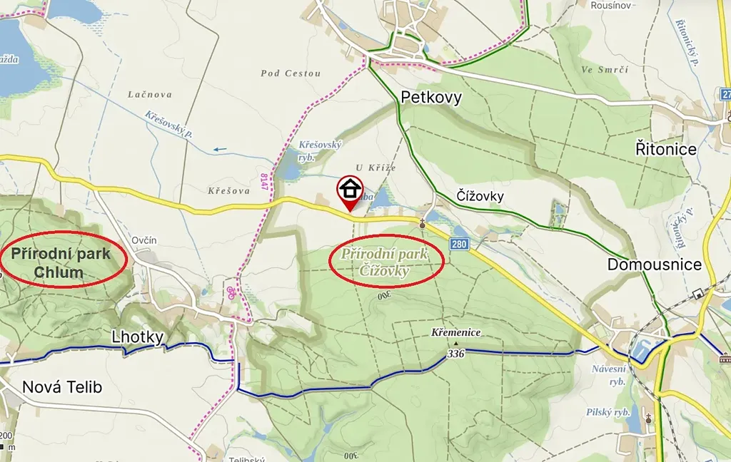 Dům stojí v malé vesničce Čížovky (část obce Petkovy) vzdálené 11 km od Mladé Boleslavi.  Na dosah od domu jsou rozlehlé lesy a několik rybníků vhodných jak na rybaření tak i koupání. Okolo domu nebudou do budoucna žádné jiné domy ani jiná výstavba, jelikož se jedná o chráněné území Přírodní park Čížovky. Dům je vhodný např. i pro milovníky koní nebo farmaření, neboť majitel vlastní okolní pozemky a je ochotný je za tímto účelem pronajmout, popř. prodat.