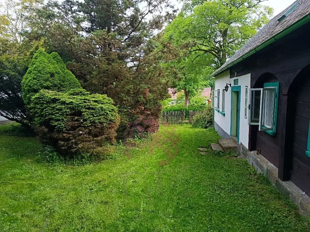 Chalupu a bytovou jednotku umístěnou nad garáží (kolaudace v roce 1991), dělí zahrada se vzrostlými stromy.