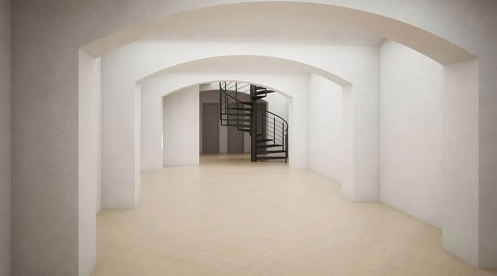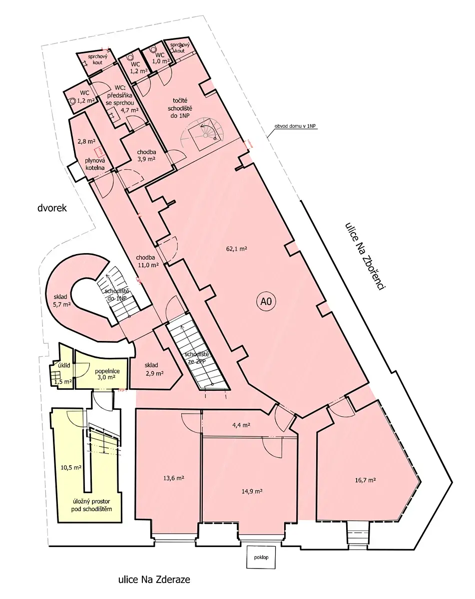 Nebytový prostor je rozdělen na přízemí 126m2 a propojený otevřeným schodištěm do suterénu, kde je dalších 146m2. Dále v -2PP jsou další skladové prostory.