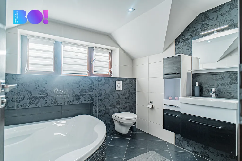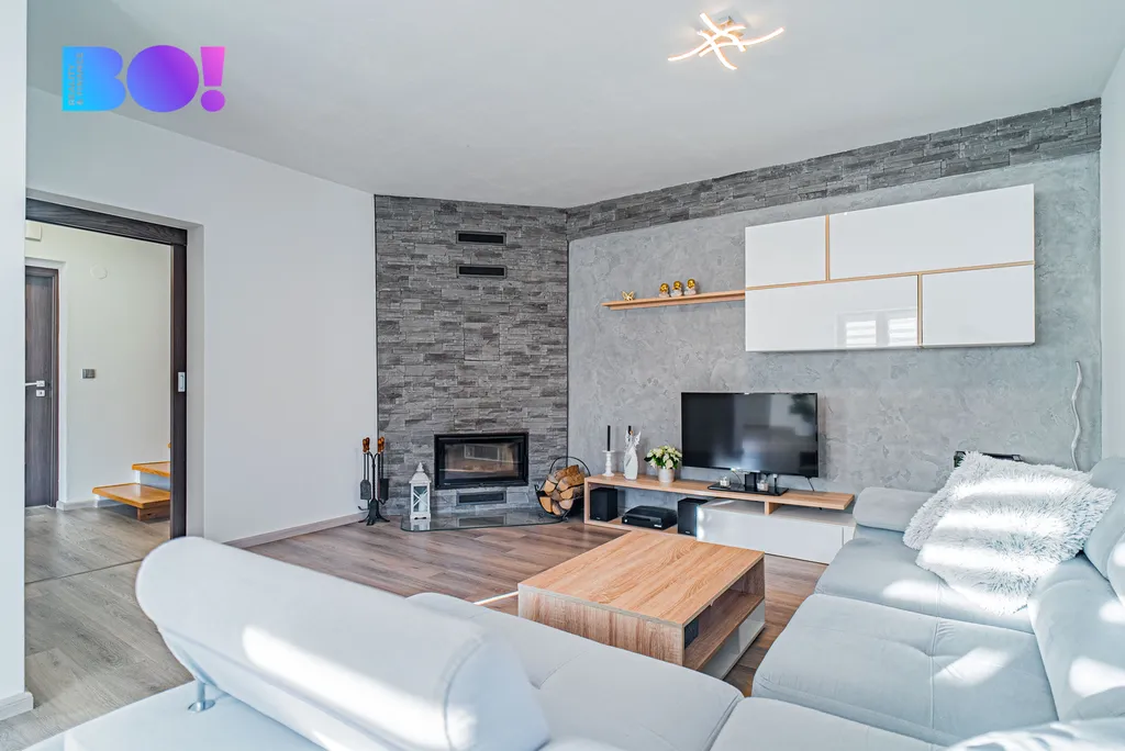 Přízemí domu tvoří prostorný obývací pokoj se vstupem na venkovní terasu, který volně navazuje na jídelní prostor a na novou moderní kuchyň. Kuchyně je kompletně vybavena spotřebiči – indukční varná deska, elektrická trouba, mikrovlnná trouba a myčka. K dispozici je také komora a samostatná toaleta. Podlahy jsou řešeny vinylovou krytinou na klik systém, v koupelně a na WC je položena dlažba. Dřevěné schodiště vede do prvního patra, kde se nacházejí dva dětské pokoje – každý s vlastním balkonem, ložnice se šatnou a balkonem a další pokoj vhodný jako pokoj pro hosty, pracovna nebo budoucí koupelna (příprava je hotová).