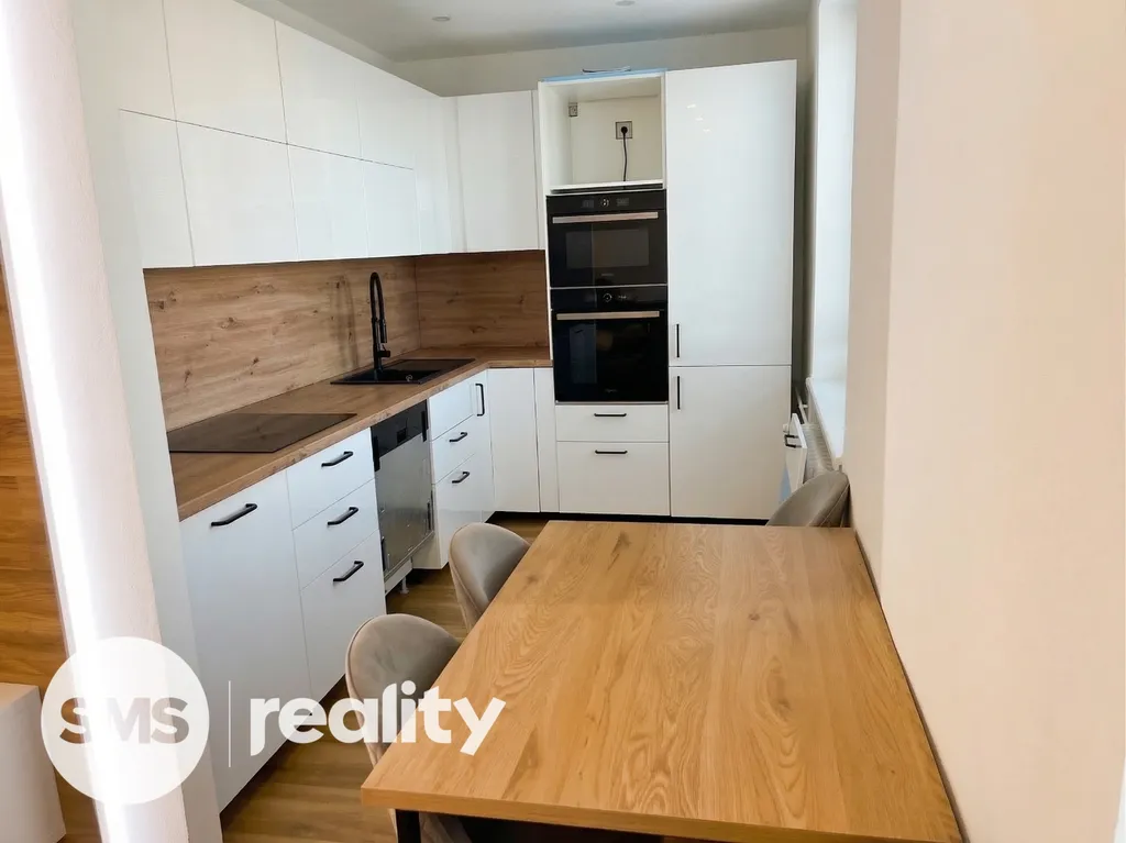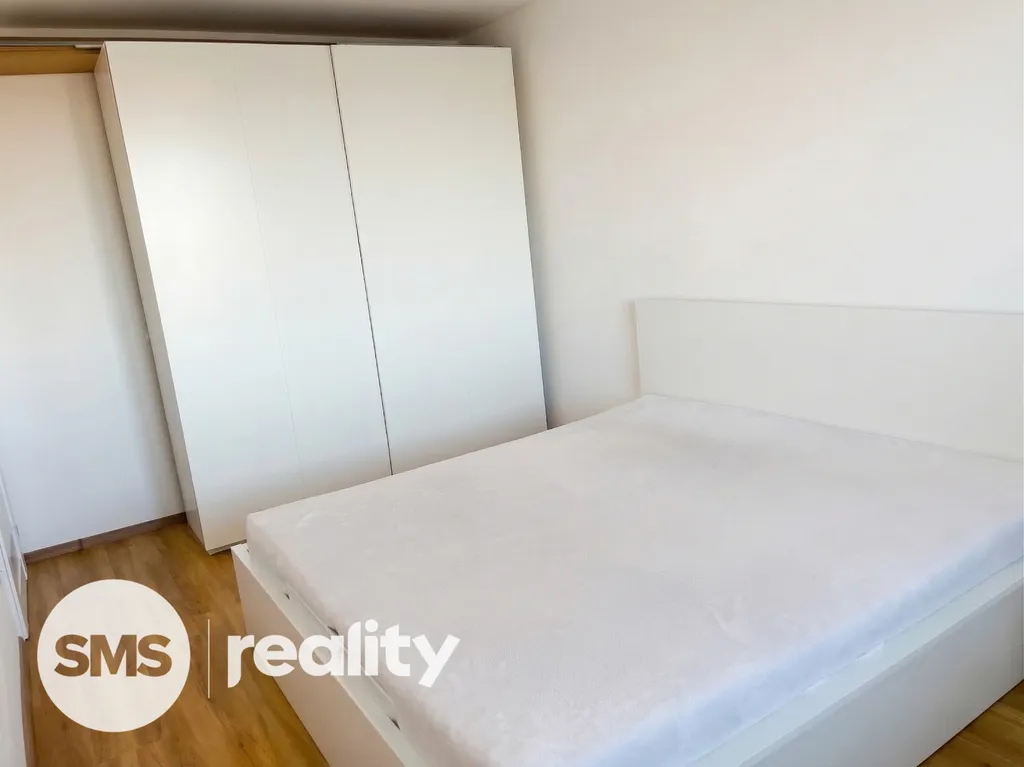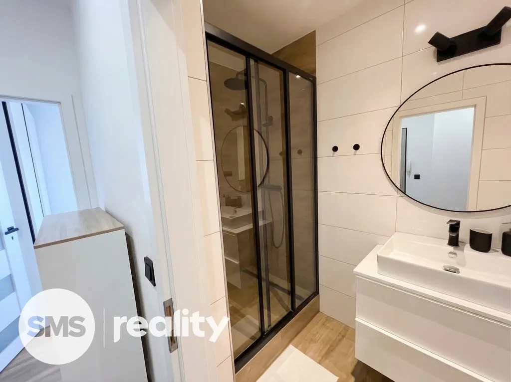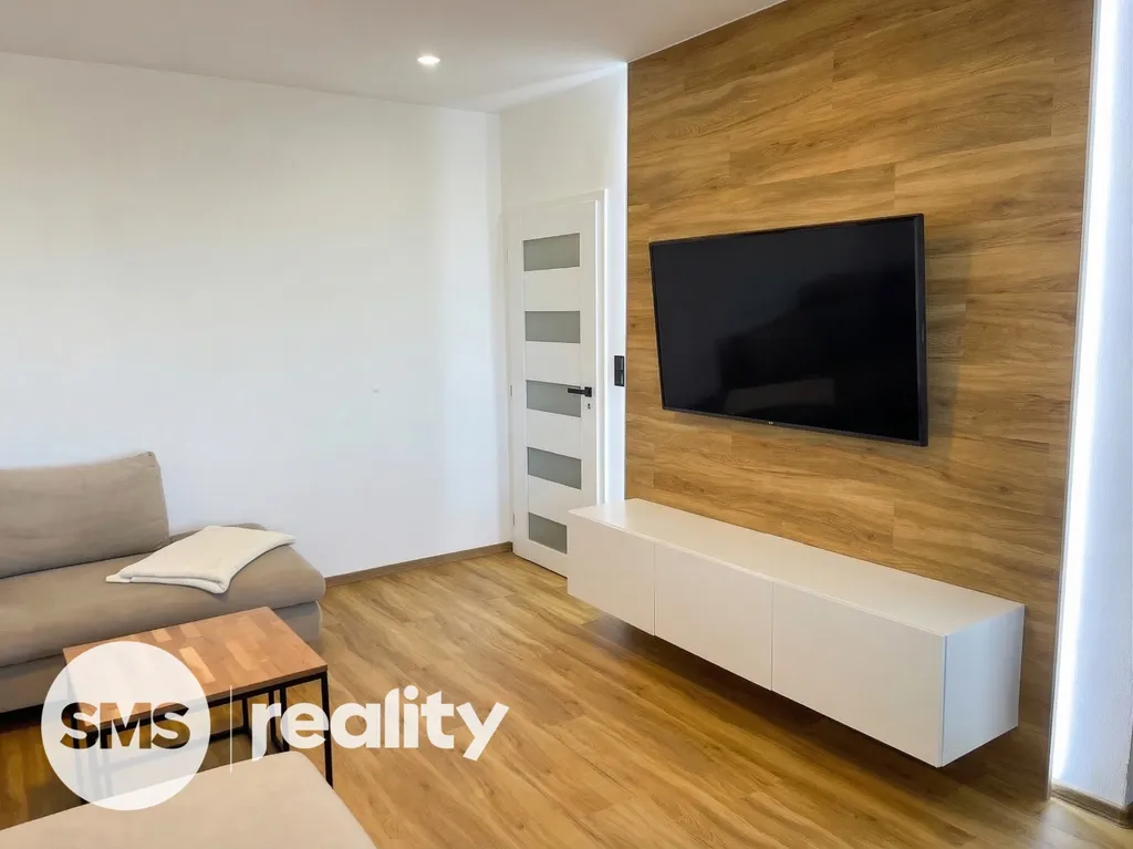 Dispozice bytu je velmi praktická a zahrnuje vstupní chodbu, samostatnou ložnici, obývací pokoj s kuchyňským koutem a koupelnu s toaletou. Obývací část je vybavena prostornou sedací soupravou, konferenčními stolky a TV skříňkou, což vytváří příjemný prostor pro relaxaci i návštěvy. Kuchyňský kout je součástí obývacího pokoje a poskytuje dostatek místa pro každodenní vaření a stolování. Ložnice je zařízena manželskou postelí, nočními stolky a úložnými prostory. Koupelna je moderně řešena se sprchovým koutem, umyvadlem se skříňkou a toaletou, vše v elegantní kombinaci bílé barvy a dřeva.