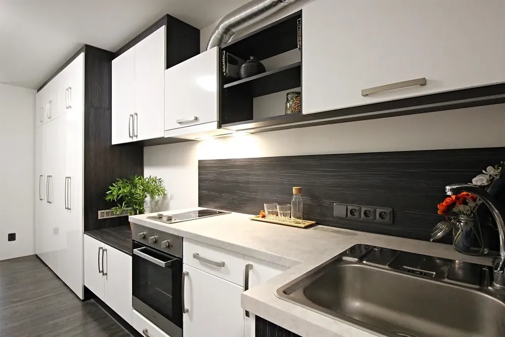 V kuchyňské části obývacího pokoje je plně vybavená kuchyňská linka se spotřebiči: varná deska, trouba, digestoř a lednice. Na kuchyňskou linku navazuje prostorná vestavěná skříň.