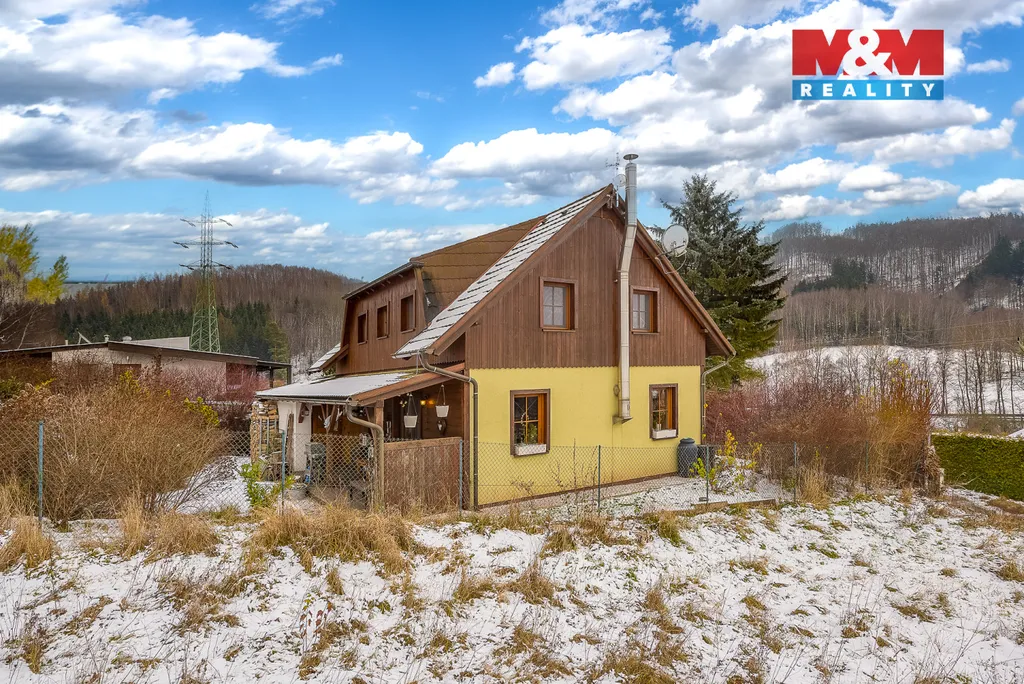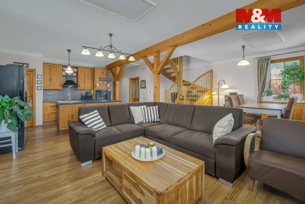 Dům je vybaven krbovými kamny, a velkým bonusem je krytá terasa s výhledem do přírody.