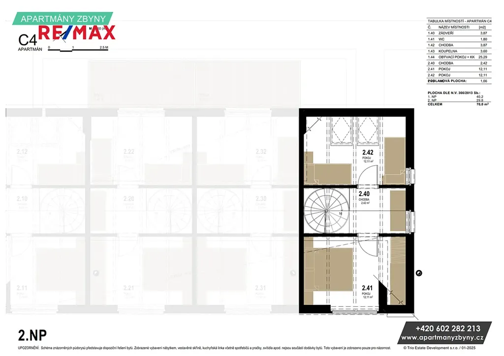• Všechny bytové jednotky jsou mezonetové; dvě z nich jsou rozšířeny o střešní terasu 8.3 m²