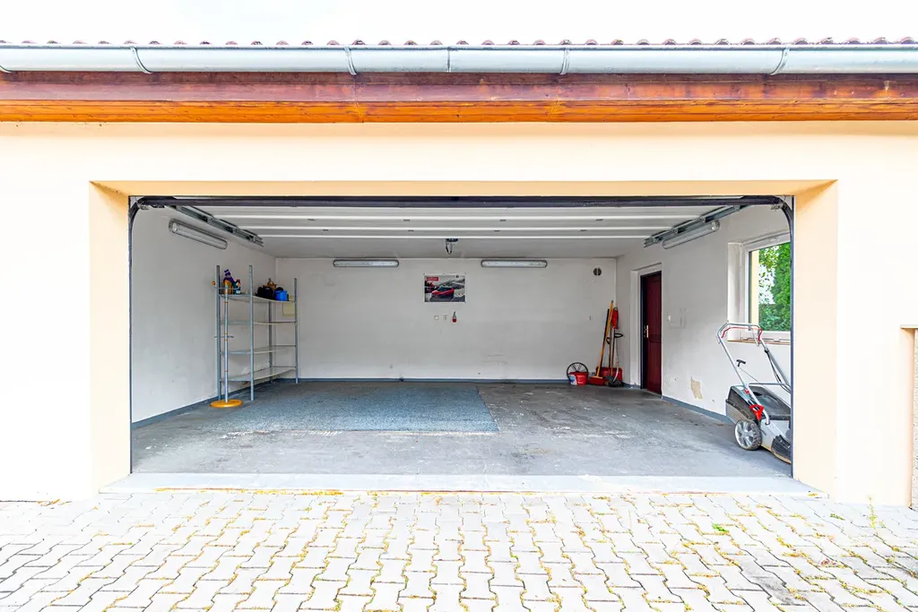 Za domem je velkorysá garáž pro dvě auta. Při příjezdu nemusíte vystupovat z auta díky dálkově ovládanému režimu rychlého otevření a automatického zavírání vrat.