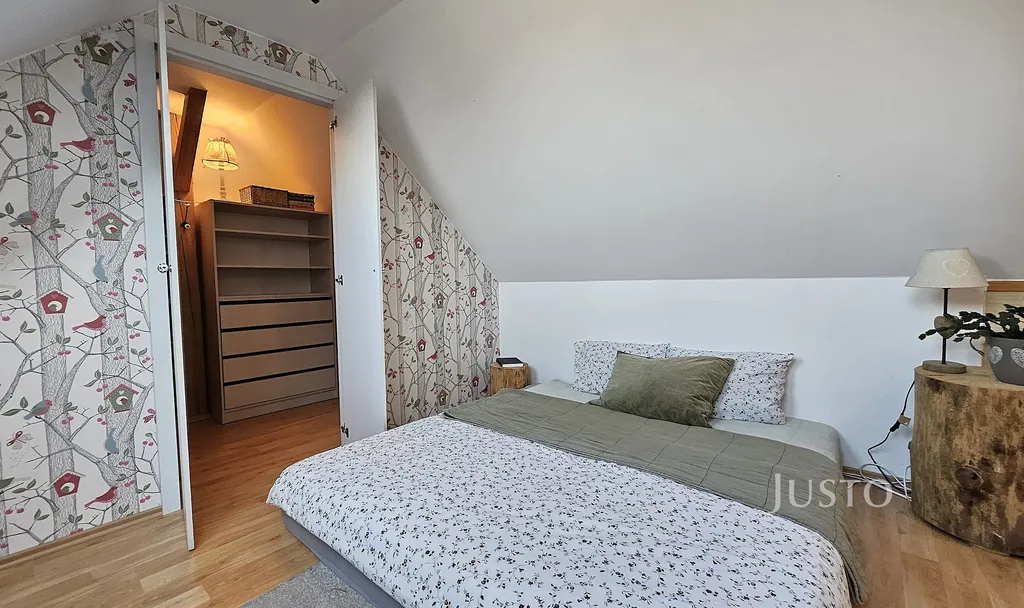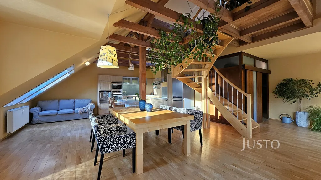 Dominantou bytu je reprezentativní obývací pokoj s jídelní částí a kuchyňským koutem, který tvoří přirozené srdce domova. Z obývacího pokoje vede elegantní schodiště do mezonetu, kde se nachází samostatná ložnice se šatnou – ideální jako rodičovská zóna, pracovna nebo pokoj pro hosty.