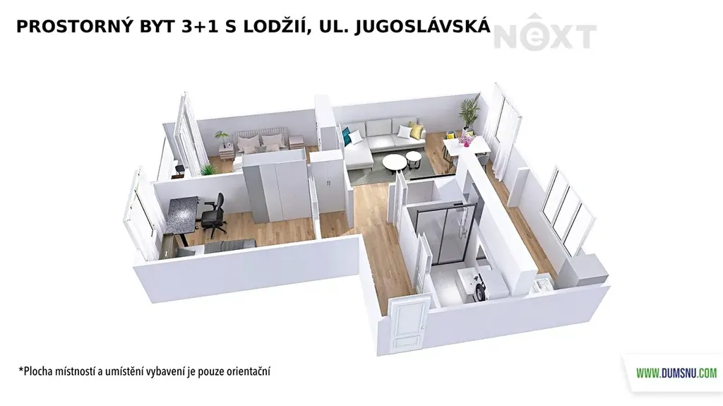 Z předsíně, která disponuje úložným prostorem, je vstup do koupelny, na samostatné WC, do pokoje a do velkého obývacího pokoje, ze kterého se dále prochází do ložnice či kuchyně. Ta je vybavena na míru vyrobenou kuchyňskou linkou s vestavěnou troubou, varnou deskou a myčkou. V koupelně najdete nadstandardní sprchový kout, umyvadlovou skříňku se zrcadlem a prostor pro pračku a sušičku. Byt dále nabízí dva samostatné pokoje, z nichž jeden má přímý vstup na lodžii s výhledem na klidnou část sídliště.