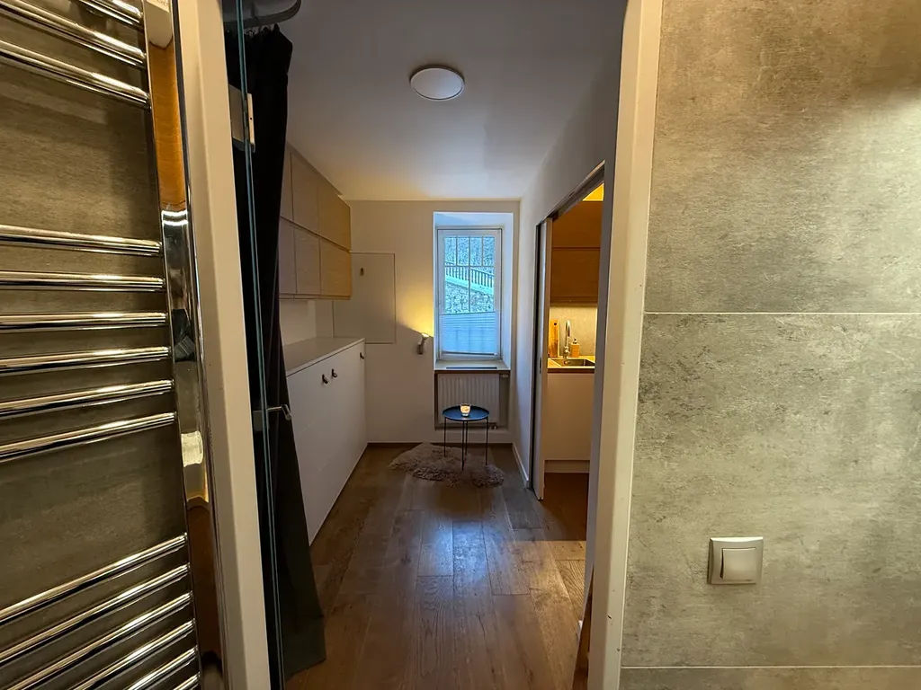 Z chodby je vstup do koupelny se sprchovým koutem a WC a zároveň do hlavního pokoje širokými posuvnými dveřmi.