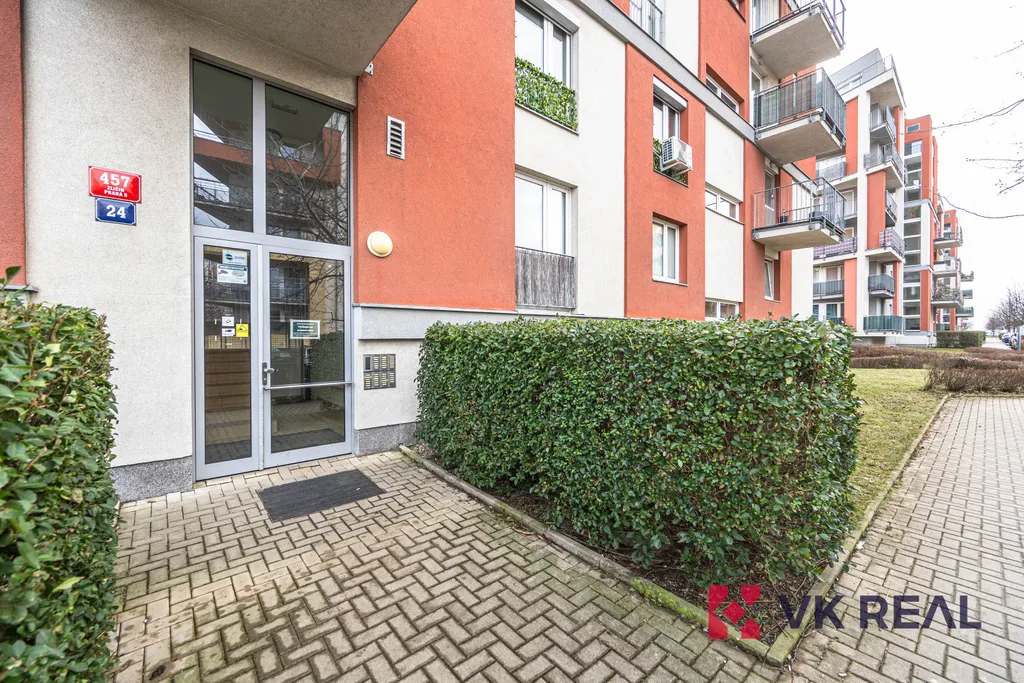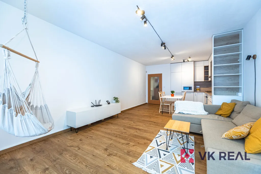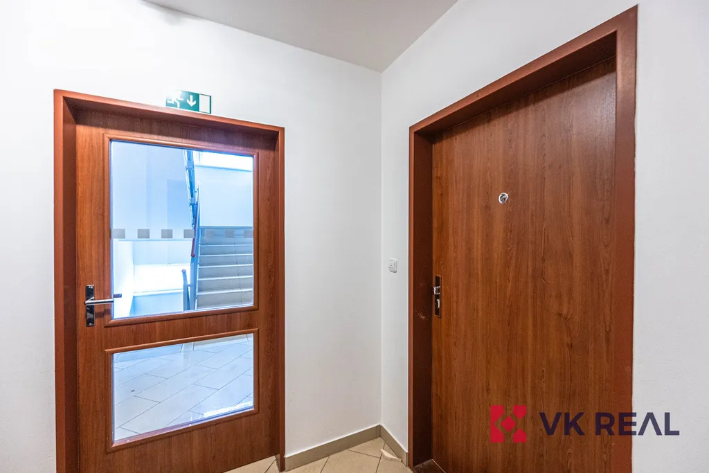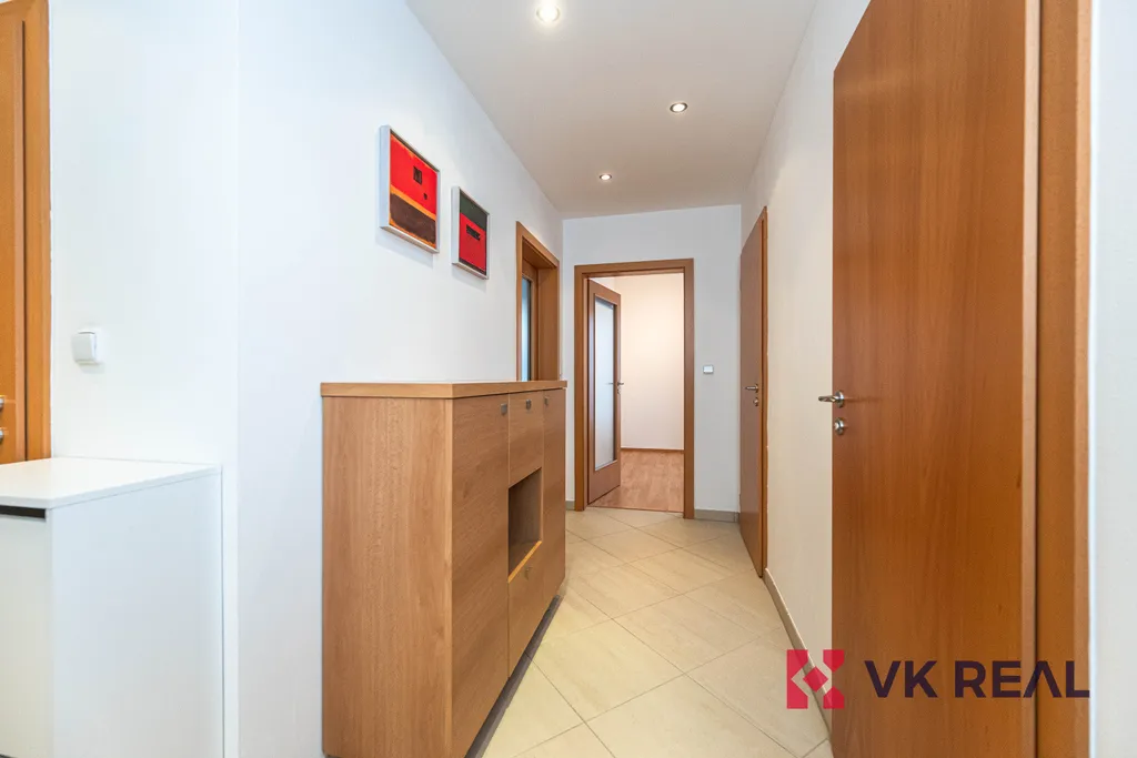 Dispozice bytu nabízí dvě samostatné ložnice, velkorysý obývací pokoj s kuchyňským koutem a přímým vstupem na balkón, dále koupelnu s pračkou i sušičkou a samostatné WC, komoru v bytě a vestavěnou skříň v předsíni, která poskytuje dostatek úložného prostoru.