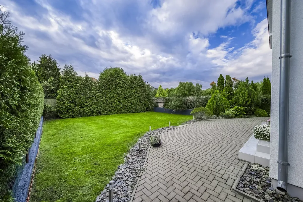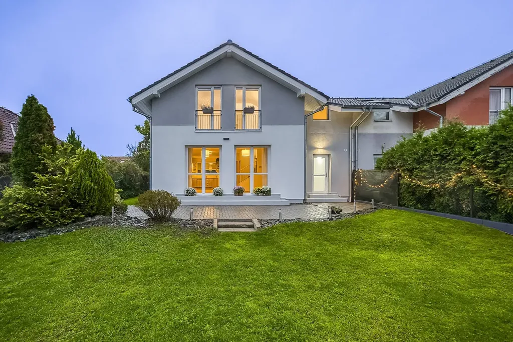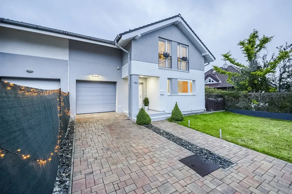 Dům nabízí komfortní dispozici 5+kk s dostatkem prostoru pro celou rodinu – prostorný obývací pokoj s přímým vstupem na zahradu, kuchyň s jídelním koutem, čtyři ložnice, koupelna, dvě toalety, technické zázemí a garáž.