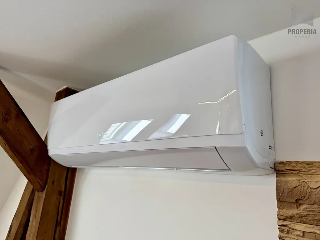 Vše je po rekonstrukci. Plně klimatizovaný mezonetový ateliér poskytne v patře prostor pro ložnici se sníženým stropem a doslova nadstandardní skladovací prostor o velikosti cca 40 m2. Komfortní spánek je tady prakticky jistý.