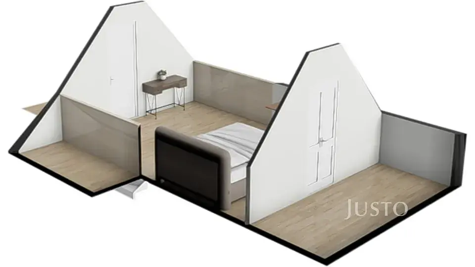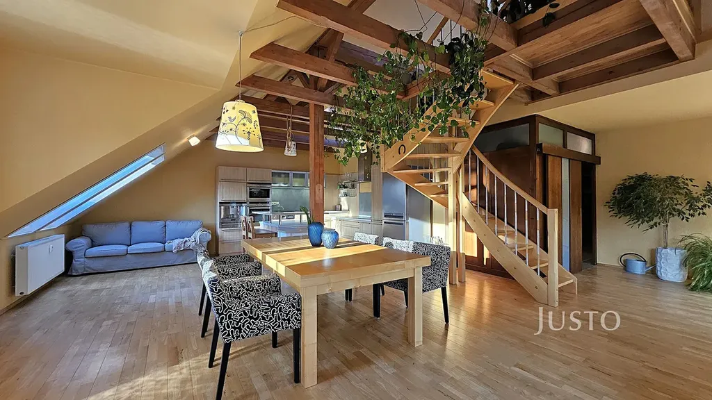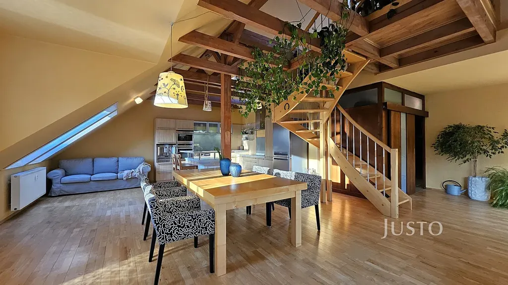 Dominantou bytu je reprezentativní obývací pokoj s jídelní částí a kuchyňským koutem, který tvoří přirozené srdce domova. Z obývacího pokoje vede elegantní schodiště do mezonetu, kde se nachází samostatná ložnice se šatnou – ideální jako rodičovská zóna, pracovna nebo pokoj pro hosty.