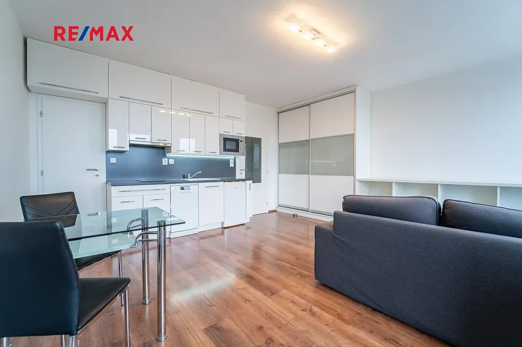 Dispozice bytu 1+kk zahrnuje obytný prostor s kuchyňským koutem, chodbu, komoru a koupelnu s toaletou. Součástí pronájmu je kuchyňská linka se spotřebiči (myčka, digestoř, lednice, elektrická varná deska, mikrovlnná trouba), vestavěné skříně, pohovka, jídelní stůl se židlemi, pračka, stropní osvětlení a kompletní vybavení koupelny. Podlahy jsou řešeny kombinací plovoucí podlahy a dlažby.
