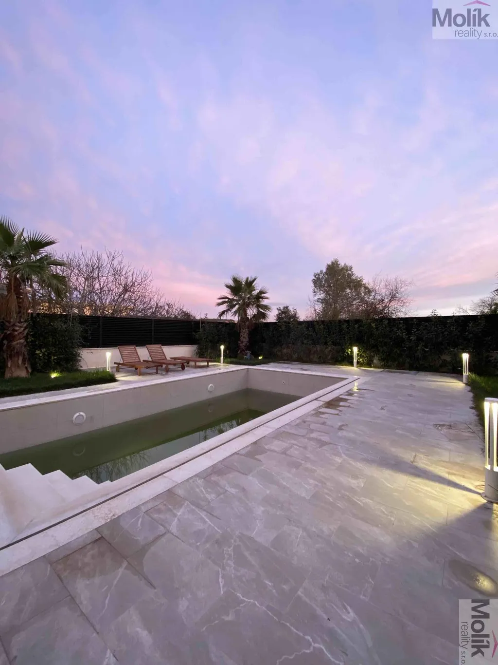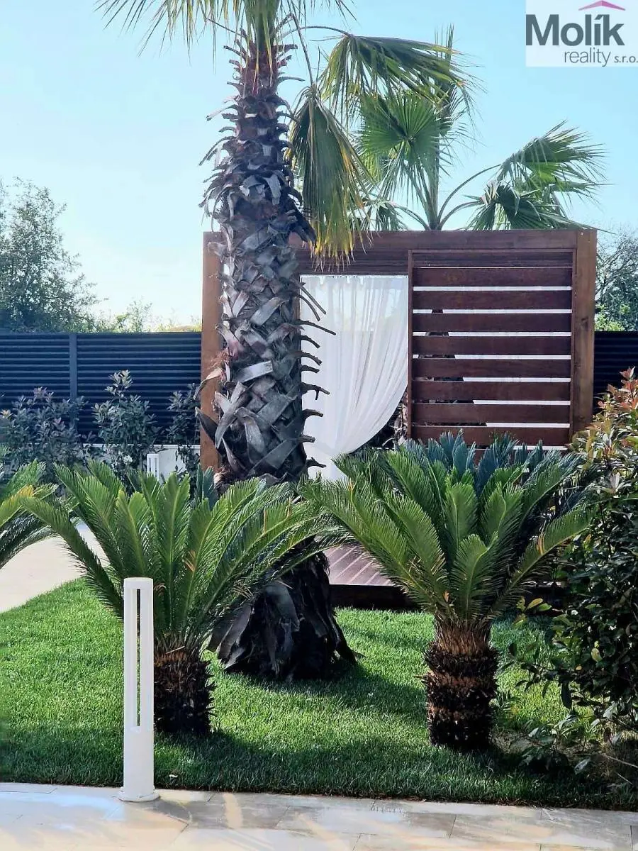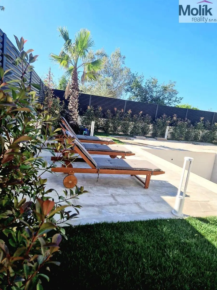Nádherná zahrada, která vrcholí zadní částí domu, kde je k dispozici soukromí a 34 m bazén (se všemi moderními mechanismy ovládání)