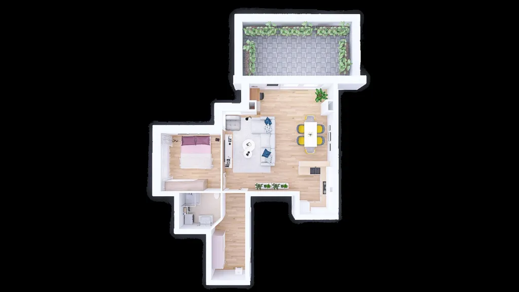 Nespornou výhodou tohoto bytu je opravdu velká terasa, na které můžete relaxovat, grilovat s přáteli, nebo třeba pěstovat zeleninu. Byt disponuje prostorným obývacím pokojem s kuchyňským koutem a jídelnou, ložnicí, koupelnou a chodbou.