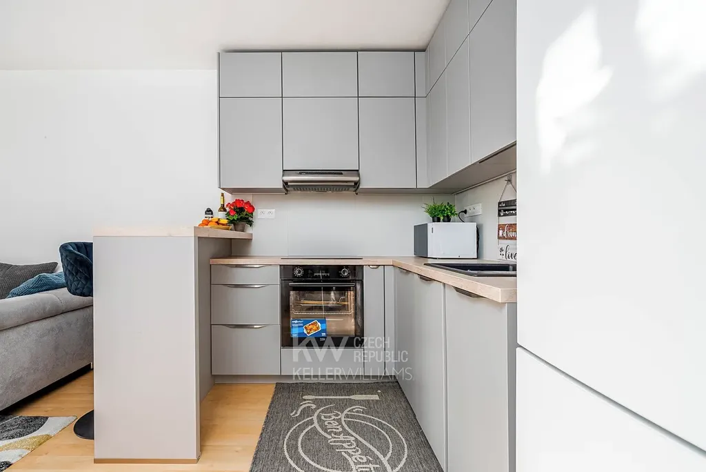 Po vstupu do bytu oceníte vestavěné skříně, které v 2+kk dělají obrovský rozdíl – byt je díky nim přehledný a „bez věcí po bytě“. Srdcem bytu je obývací pokoj s kuchyňským koutem a vstupem na balkon. Kuchyňská linka je po rekonstrukci a je řešená moderně a čistě, takže byt působí svěže hned při vstupu do místnosti.