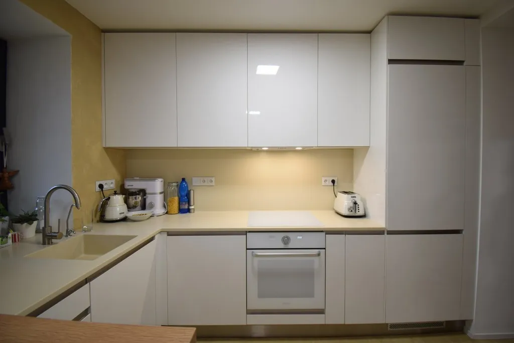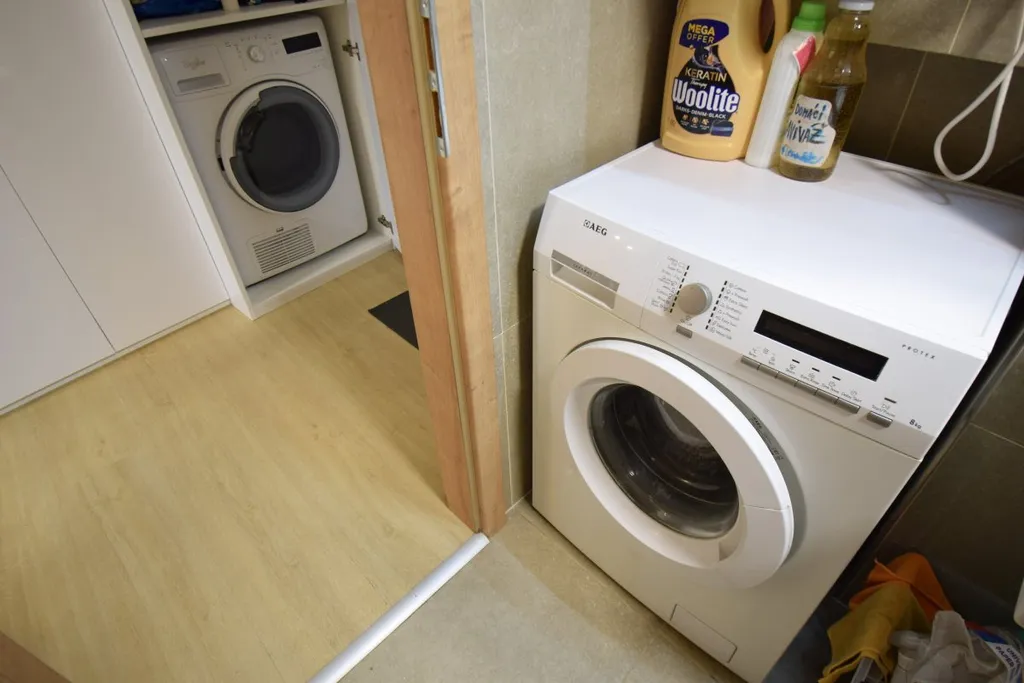 Byt se nabízí částečně vybavený. V designové kuchyni najdeme elektrickou varnou desku, myčku, digestoř, elektrickou troubu a lednici. Obývací pokoj disponuje pohovkou, konferenčním stolkem a televizí. Dále zde najdeme jídelní stůl se židlemi. Ložnice je vybavena manželskou postelí. Z obývacího pokoje i z ložnice můžeme vstoupit na terasu a upravenou zahrádku. V koupelně je k dispozici sprchový kout, umyvadlo a toaleta. K dispozici zůstává i pračka a sušička. V zádveří najdeme praktické skříně.