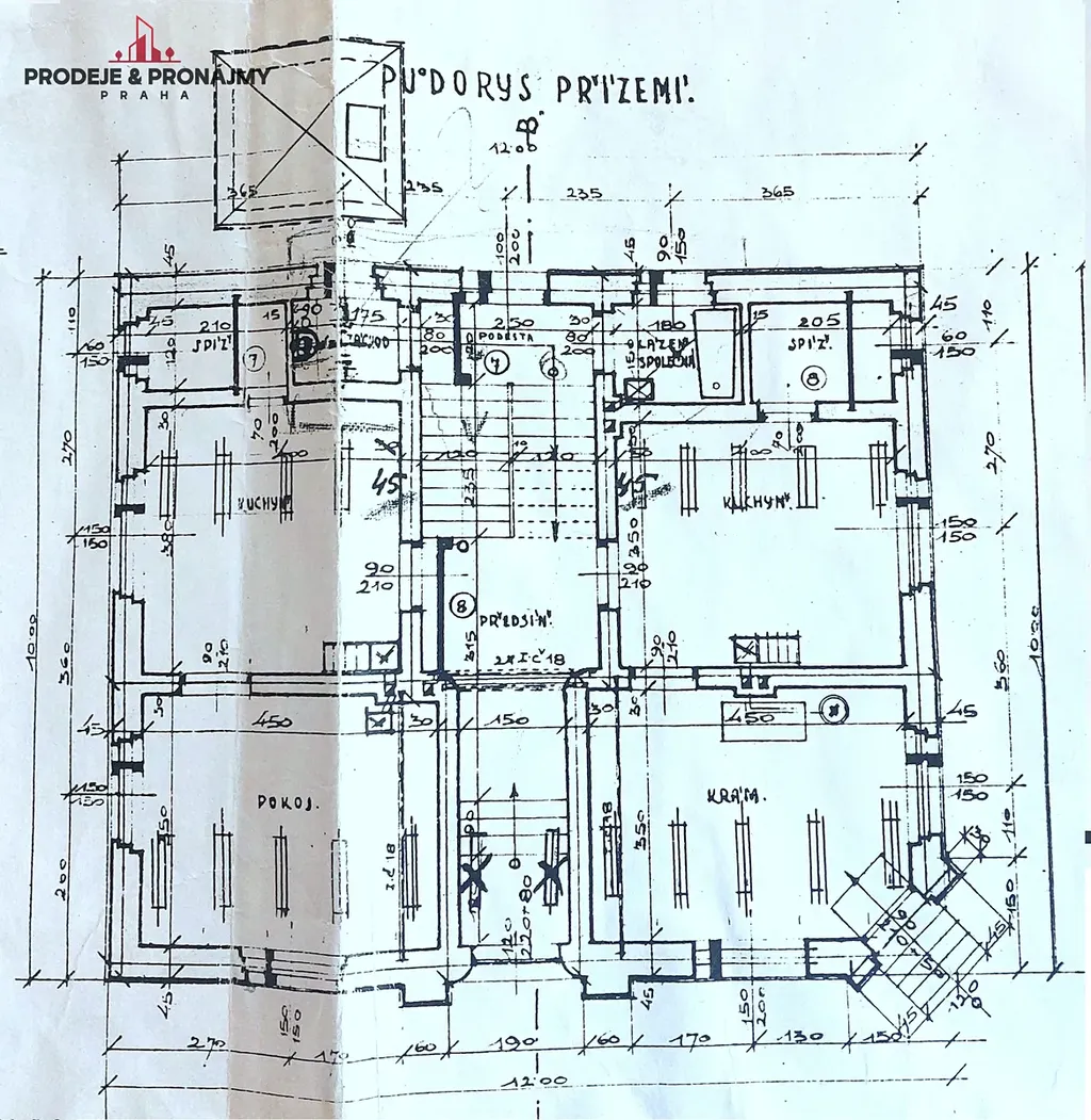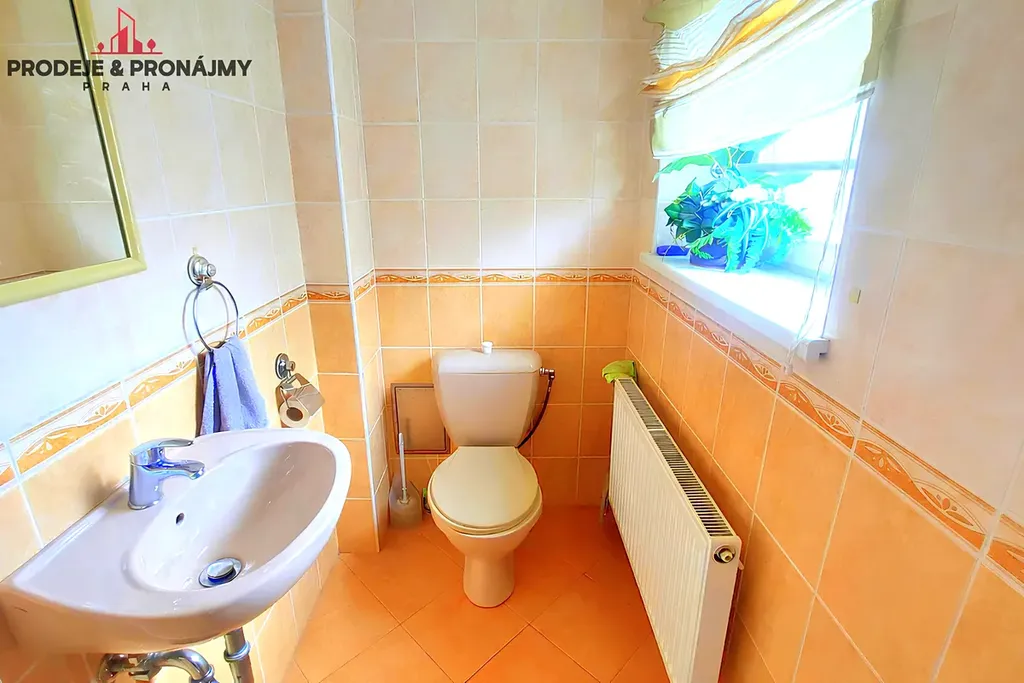 Přízemí disponuje: Pracovnou, koupelnou s vanou, samostatné WC, ložnici a prostornou obývací místnosti s funkčním krbem a vstupem do komory.
